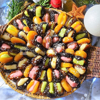 La veille: veloutés, feuilletés, salades de riz, bûche, pudding, truffes, fruits déguisés.